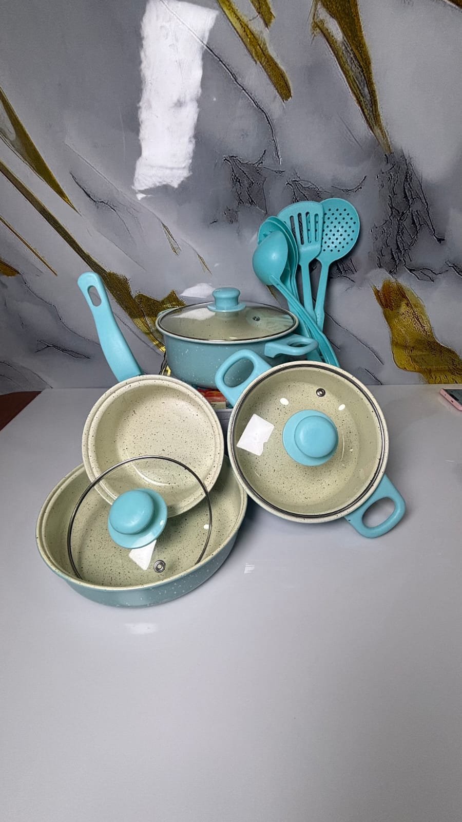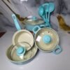 Excelente juego de ollas, con sus tapas en vidrio y los cucharones en pasta la cual evita que se rayen y dañen los productos